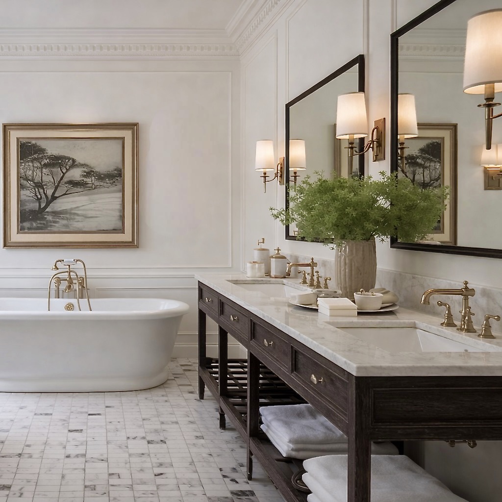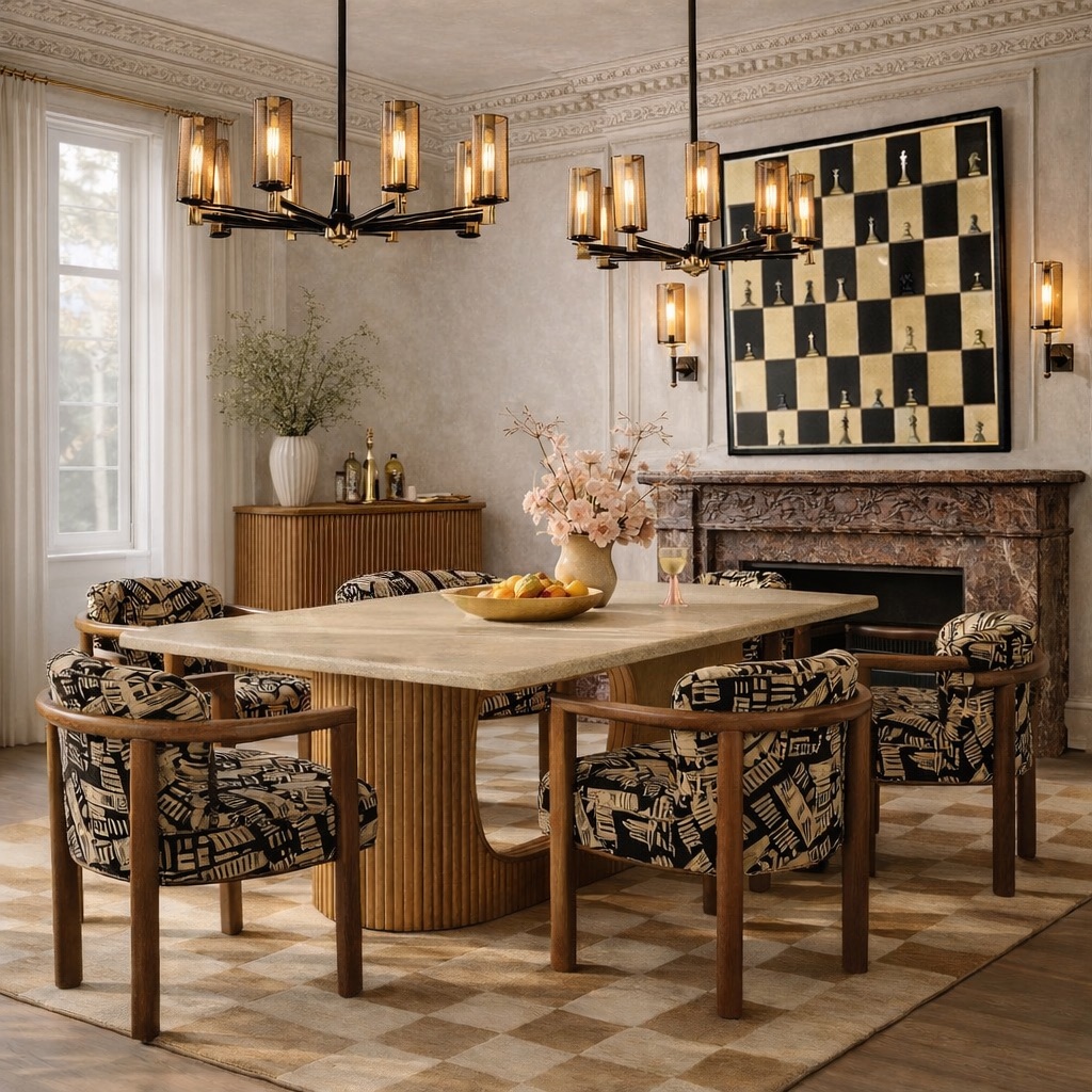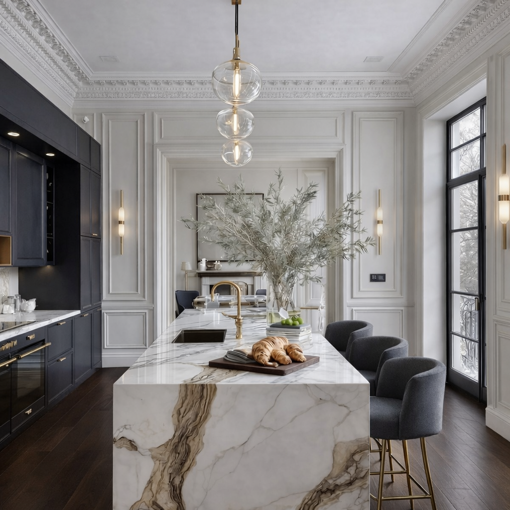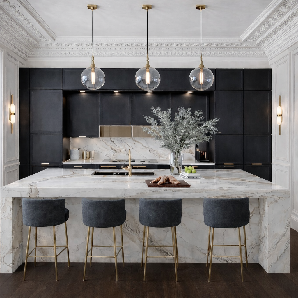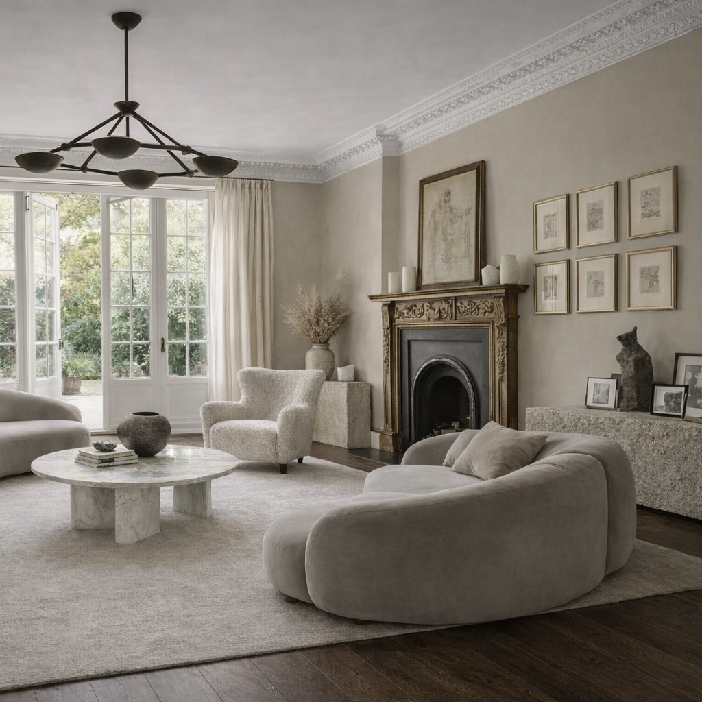 The concept focused on respectful restoration. Intricate Georgian coving and reinstated fireplaces re-established the home’s original proportions and elegance, with the red marble fireplace in the dining room acting as a key reference point for colour and material choices throughout the house.The design concept focused on enriching the home with a warm, comforting palette and soft, tactile finishes. We introduced creamy brick tones in the kitchen and living areas, blended with warm taupes and gentle beiges that created a calm, cohesive backdrop throughout. Curves became a central motif, echoing the beautiful curved roofline in one of the bedrooms and subtly repeating this form in joinery, accessories, and key furnishings.