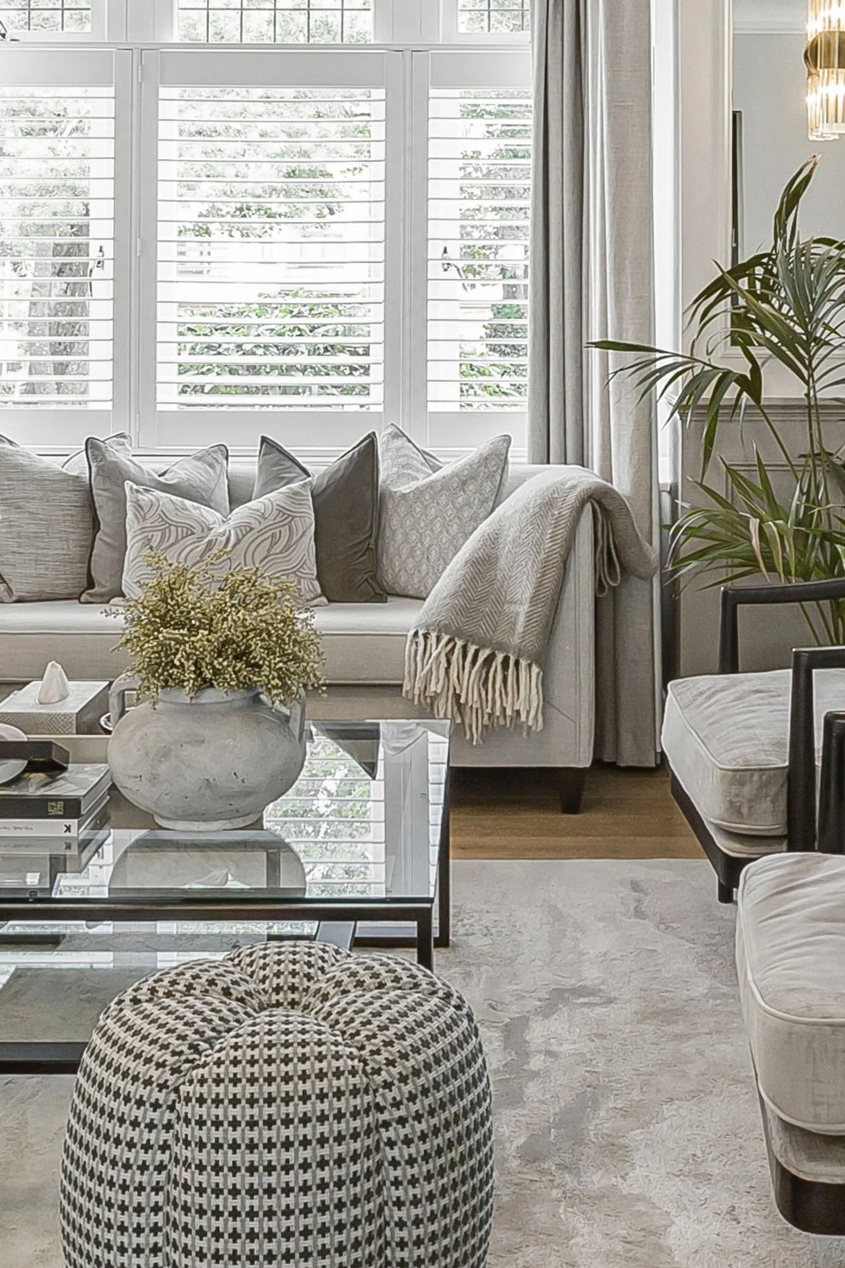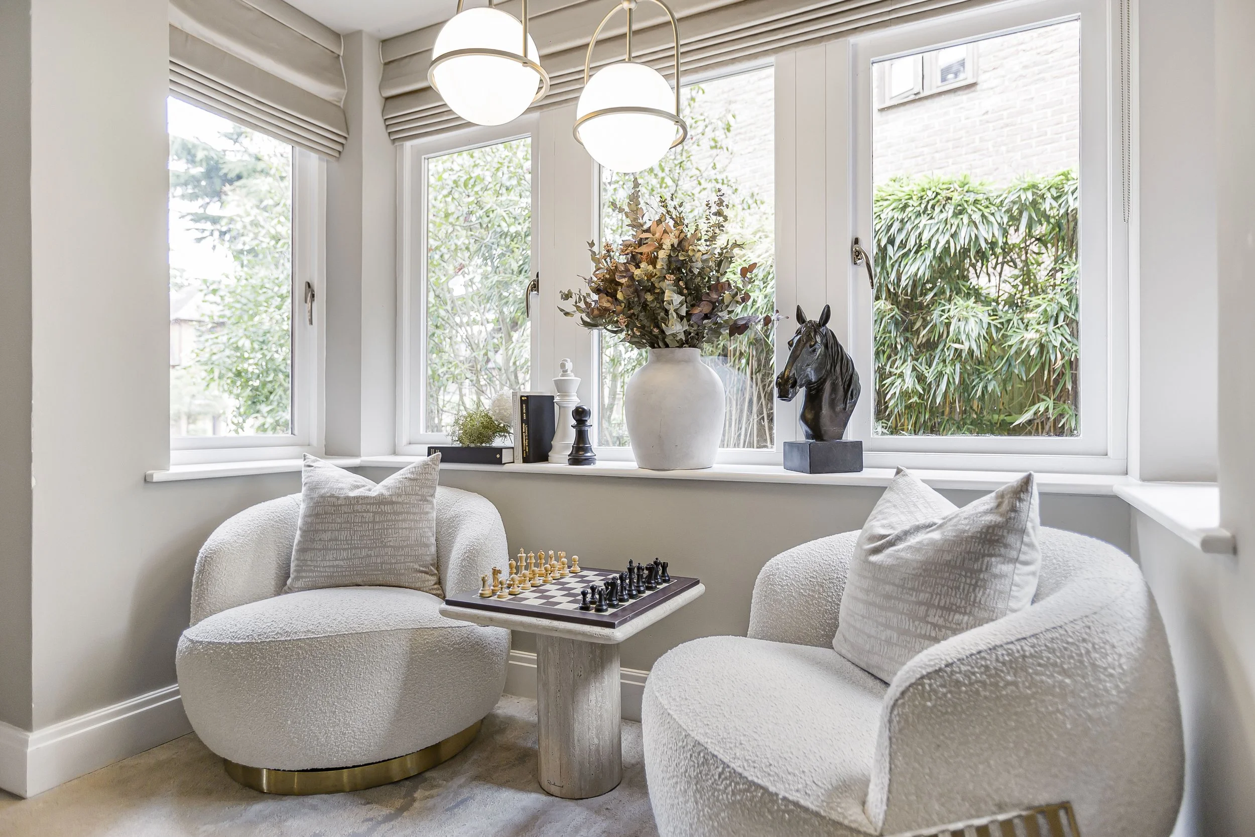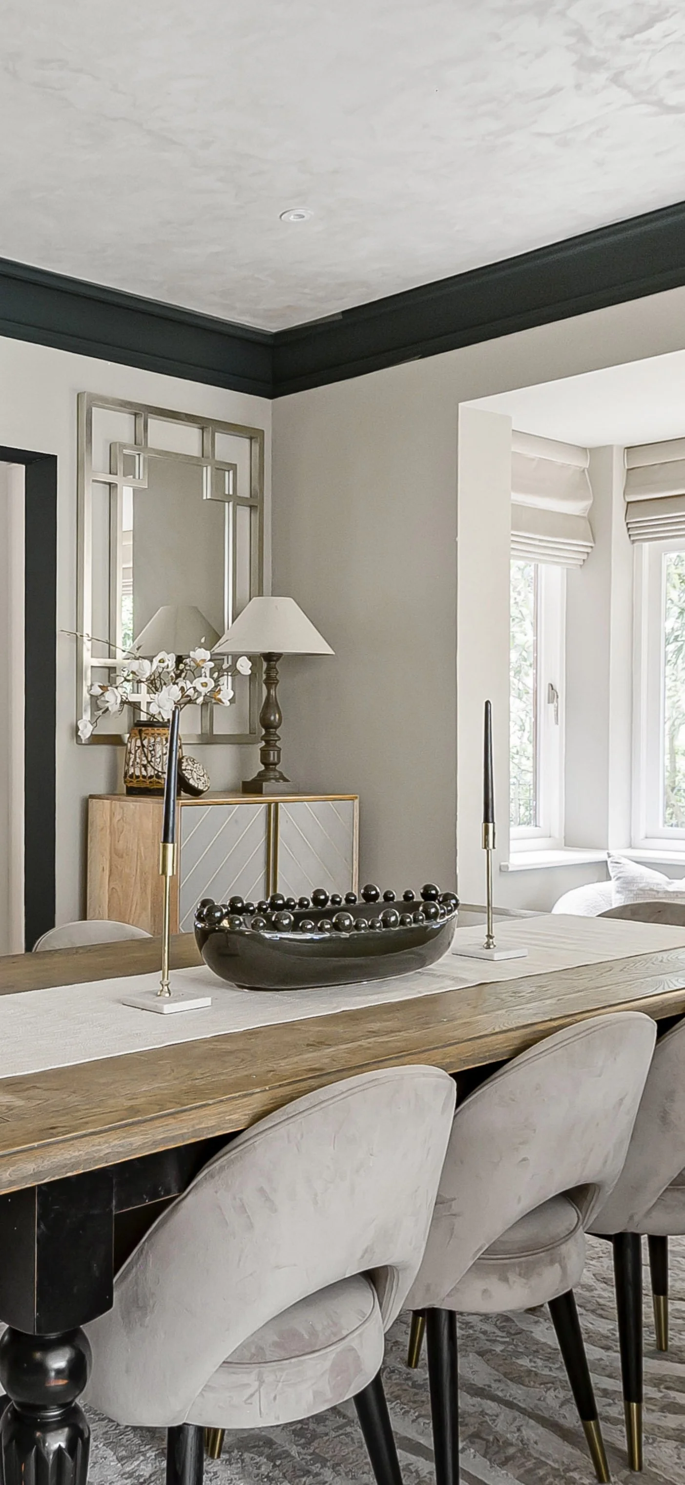 To bring warmth and balance, I developed a palette of warm neutrals paired with earthy greens. This timeless scheme created a calm backdrop that complemented the architecture of the home. Existing furniture was reupholstered and thoughtfully paired with new pieces, balancing sustainability with a fresh aesthetic. In the living area, darker panelling on the lower walls created a cocooning, intimate feel, while lighter tones above helped reflect natural light and keep the space airy.
