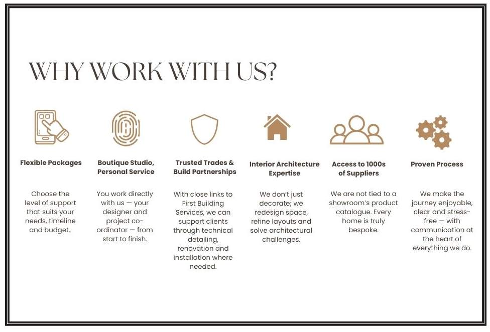 We also design small commercial environments that benefit from a residential touch — spaces that feel warm, welcoming and beautifully composed. From boutique offices and studios to treatment rooms, show suites and hospitality corners, we bring the same thoughtful approach used in our residential work to create environments that feel elevated, functional and deeply considered.